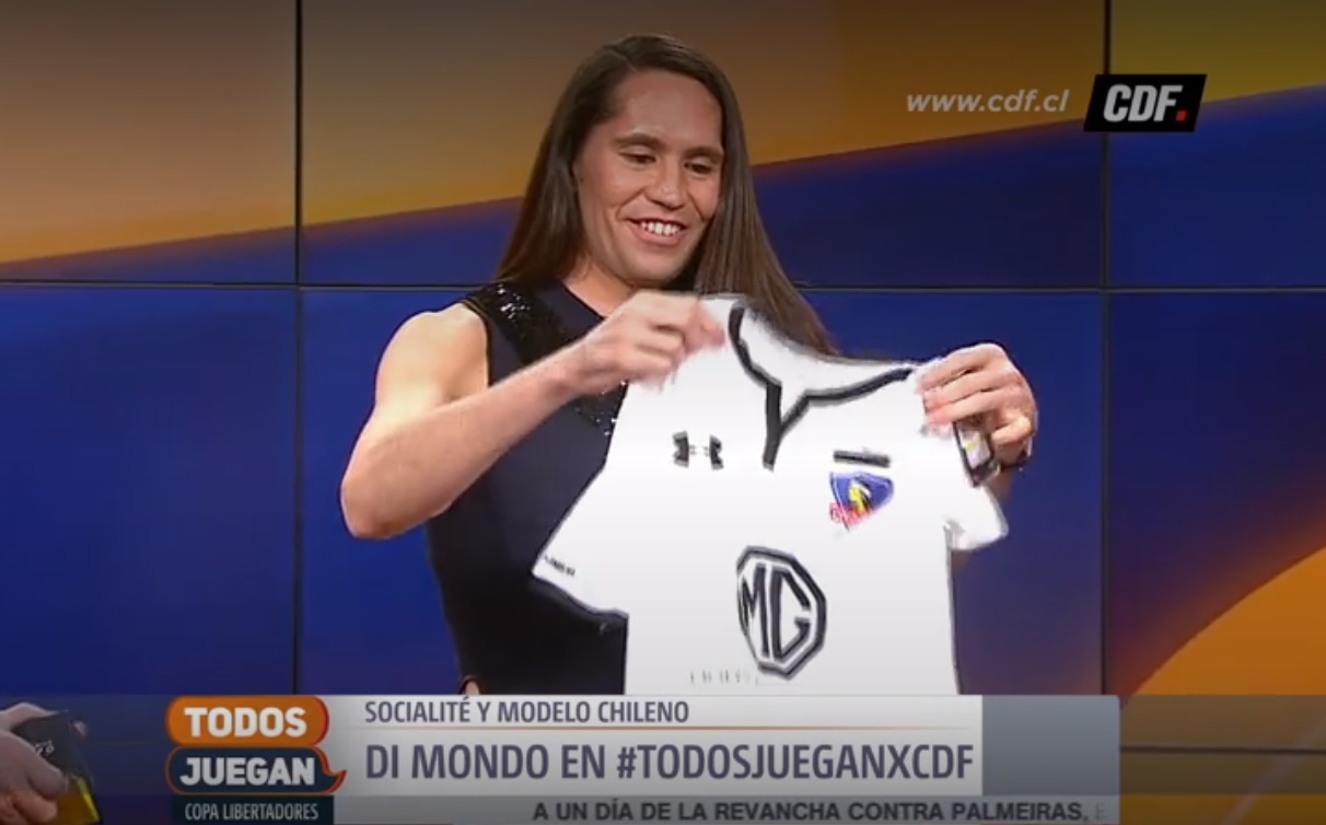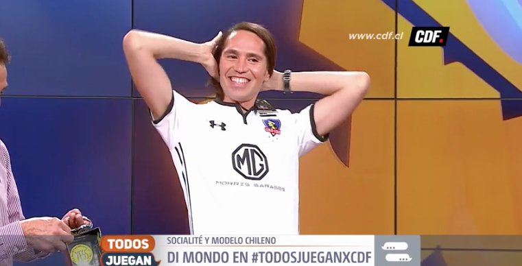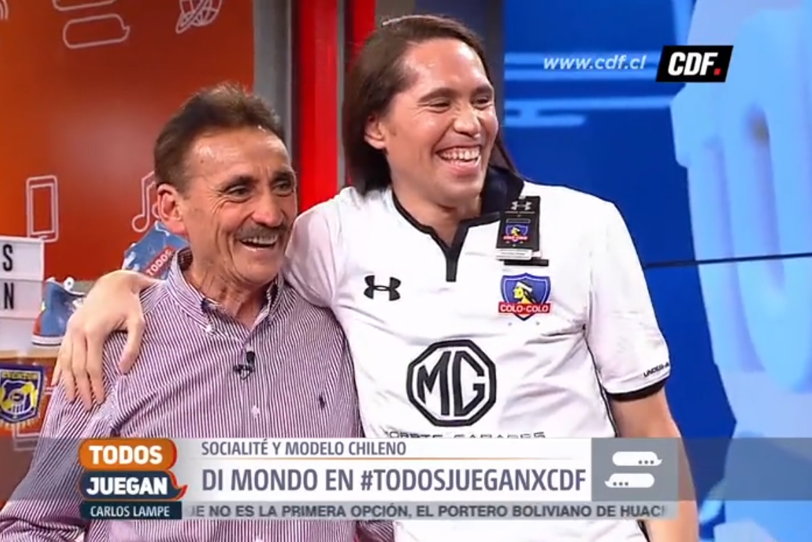 Por eso el equipo del programa decidió regalarle al fashionista una camiseta de Colo-Colo, la que se puso enseguida. Al final del programa, Di Mondo posó con la camiseta alba junto a todo el panel del programa y junto a su padre.
