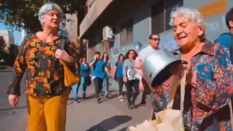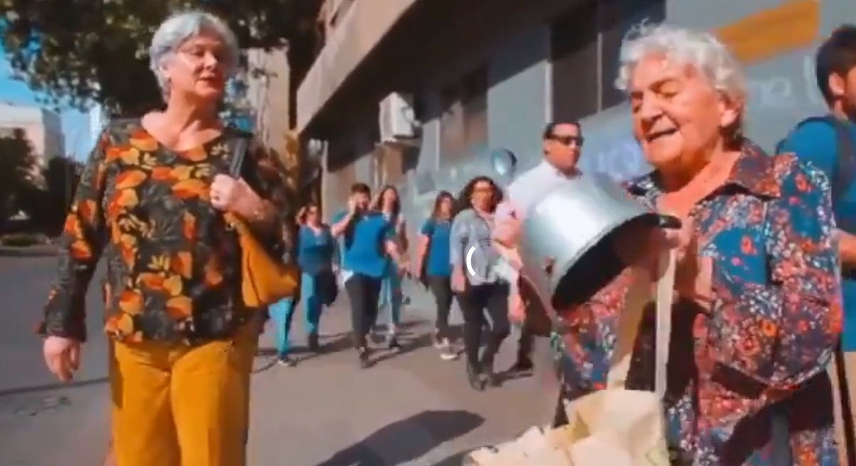 Si bien una de ellas se muestra muy compuesta y crítica con las demandas, la otra la increpa y con olla y cuchara de palo en mano, le canta a la otra "basta ya, pacos y milicos a la AFP", aludiendo a las altas pensiones que tienen funcionarios de las Fuerzas Armadas y de Orden. Esta señora fue aplaudida por varios en redes sociales.