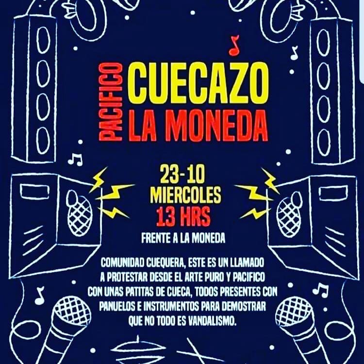 "Comunidad cuequera, este es un llamado a protestar desde el arte puro y pacífico con unas patitas de cueca. Todos presentes con pañuelos e instrumentos para demostrar que no todo es vandalismo", escribió.