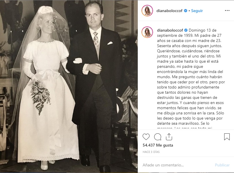 "Domingo 13 de septiembre de 1959. Mi padre de 27 años se casaba con mi madre de 23. Sesenta años después siguen juntos. Queriéndose, cuidándose, riéndose juntos y también el uno del otro. Mi madre ya sabe hasta lo que él está pensando, mi padre sigue encontrándola la mujer más linda del mundo", partió escribiendo Diana.