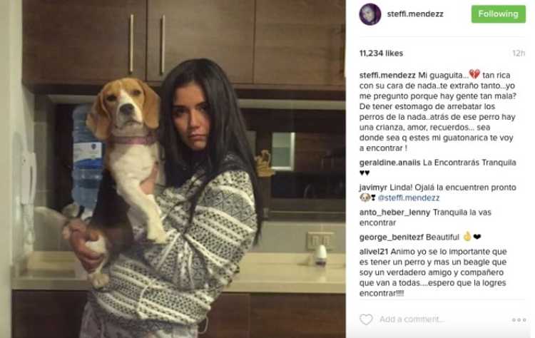 Ante la desesperación, Steffi publicó una foto junto su perrita, acompañada con el mensaje: "Mi guaguita, tan rica con su cara de nada. Te extraño tanto. Yo me pregunto ¿Por qué hay gente tan mala? ¿De tener estómago de arrebatar los perros de la nada? Atrás de ese perrito hay una crianza, amor, recuerdos. Sea donde sea que estés mi 'guatona rica' te voy a encontrar".