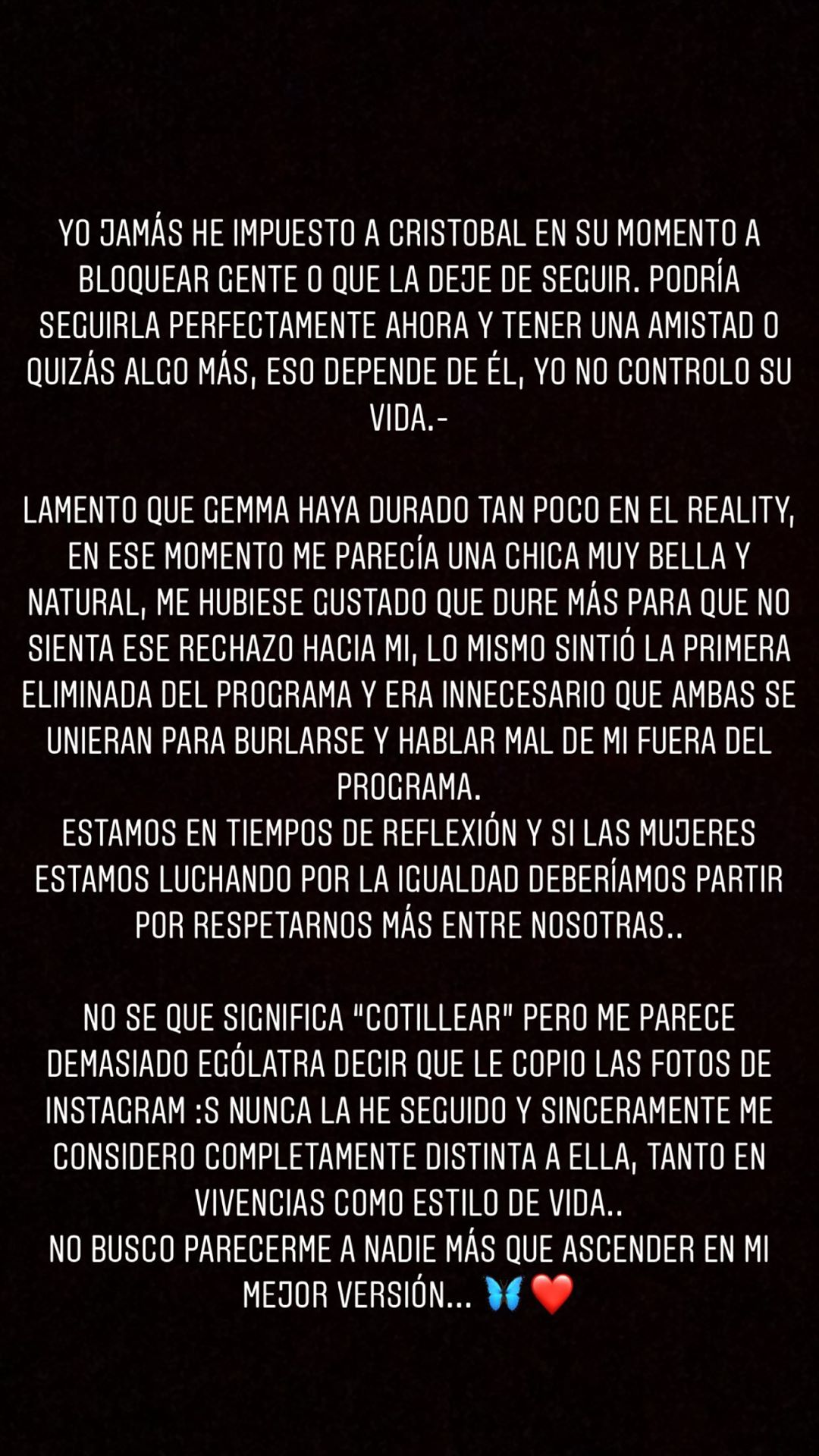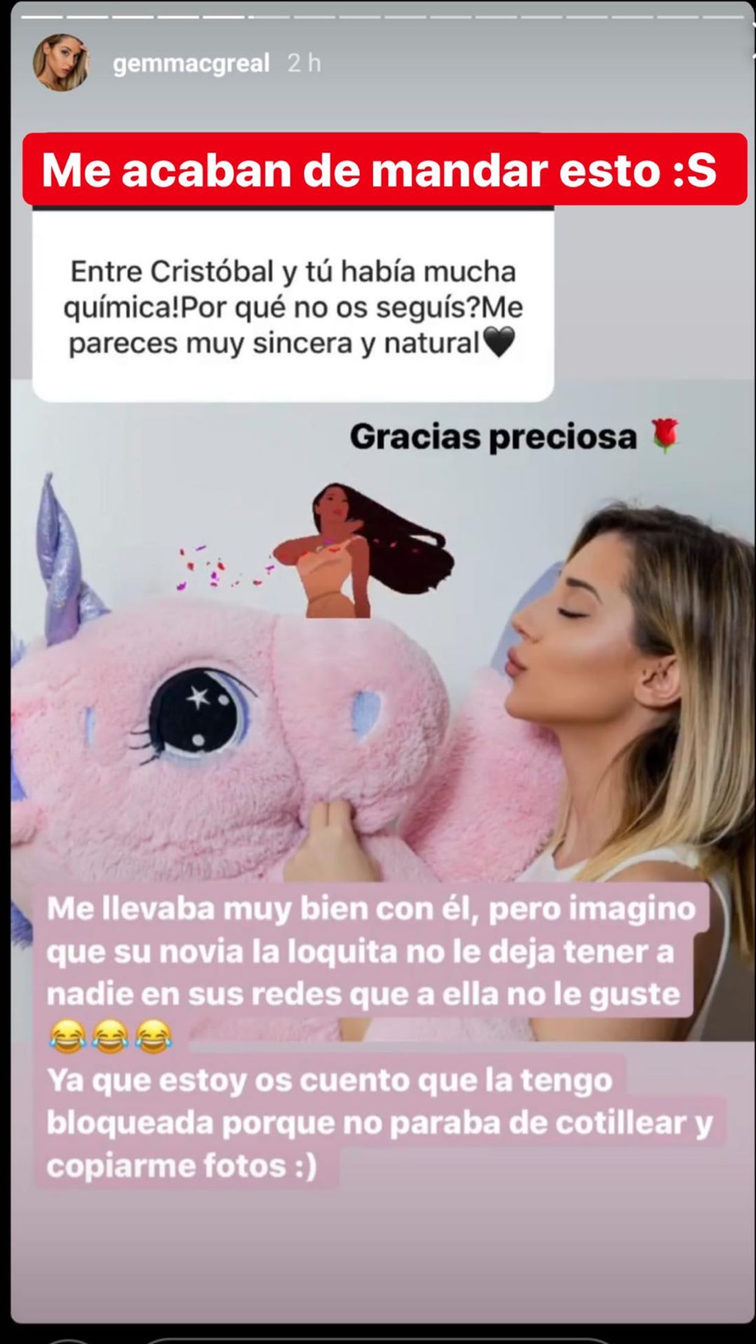 Esto ocurrió cuando la española abrió una serie de preguntas y respuestas para interactuar con sus seguidores. En ese momento, recibió una pregunta: "Entre Cristóbal y tú había mucha química. ¿Por qué no os seguís? Me pareces muy sincera y natural".