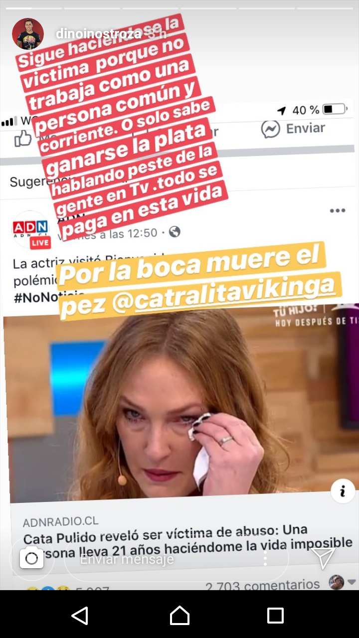 'Sigue haciéndose la víctima, porque no trabaja como una persona común y corriente. O solo sabe ganarse la plata hablando peste de la gente TV. Todo se paga en esta vida', agregó Inostroza en referencia a Cata Pulido.
