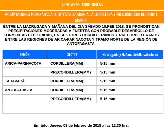 Además especificaron que las precipitaciones serán hasta el lunes 12 de febrero (en la cordillera de la Región de Arica y Parinacota, y Tarapacá), mientras que durarán hasta el sábado 10 en la cordillera de la Región de Antofagasta. Eso se producirá en el periodo tarde-noche.