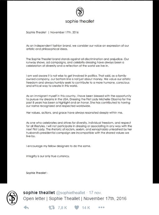 Sophie Theallet, quien vistió por 8 años a la actual Michelle Obama, esposa del Presidente de Estados Unidos, Barack Obama, publicó en su cuenta de Twitter (@sophietheallet) una honesta carta de declaración de principios: "No participaré ni me relacionaré de modo alguno con la próxima Primera Dama", haciendo referencia a Melania Trump.