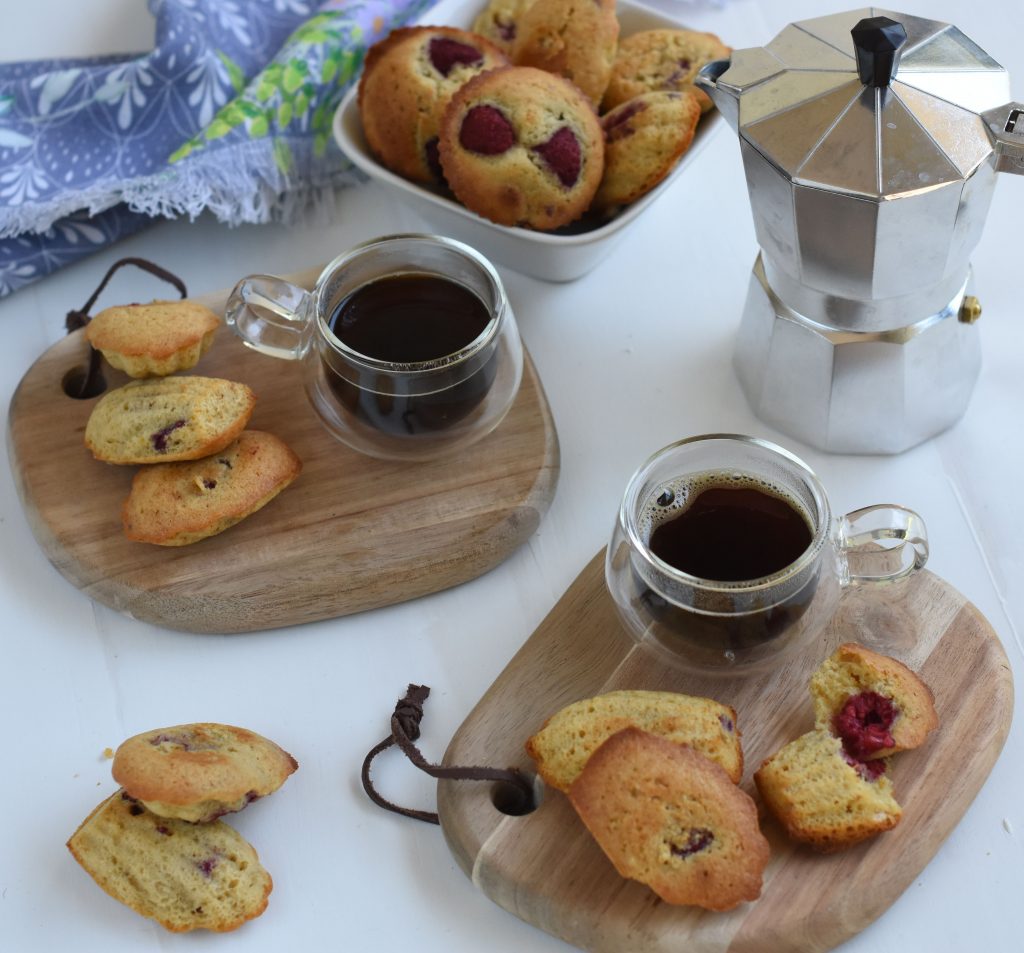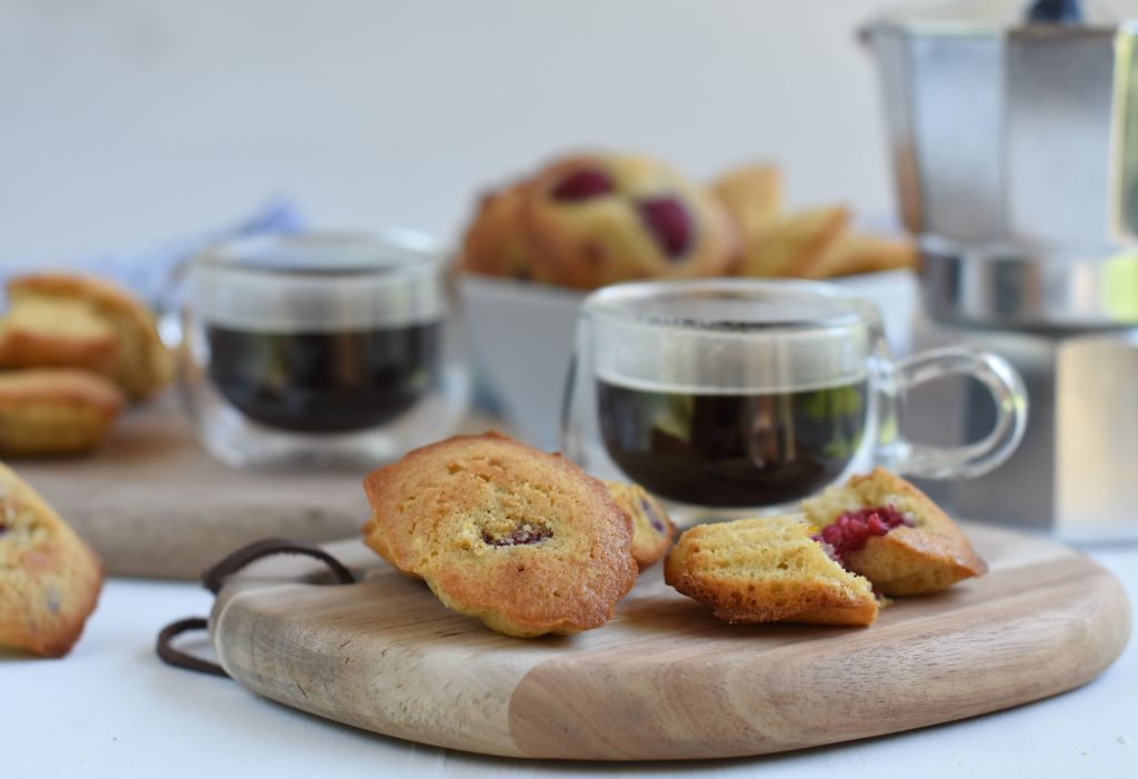 Batir los huevos con el azúcar, miel y ralladura, hasta tener una mezcla cremosa y pálida. Agregar la mantequilla derretida y batir hasta integrar. Agregar las harinas y el polvo, batir solo hasta integrar; mejor si lo hacen a mano para no sobre batir. Incorporar las frambuesas en forma envolvente.
