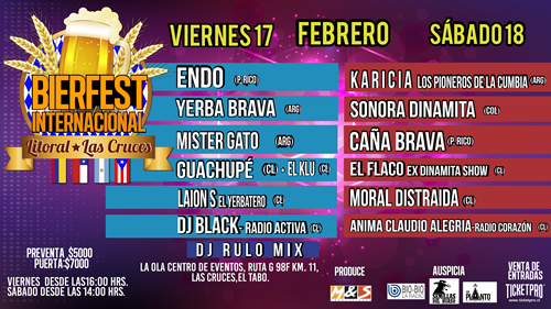 - ¡Y qué rico panorama es el que tienen en la Quinta Región! Así es, porque en este fin de semana se estará realizando el Bierfest Internacional Las Cruces, una fiesta dedicada a la cerveza que tendrá como sede la comuna de El Tabo y que contará con el show de artistas como Guachupé, Sonora Dinamita, Caña Brava, Moral Distraída, DJ Black, entre otros. ¡Ya lo sabes!