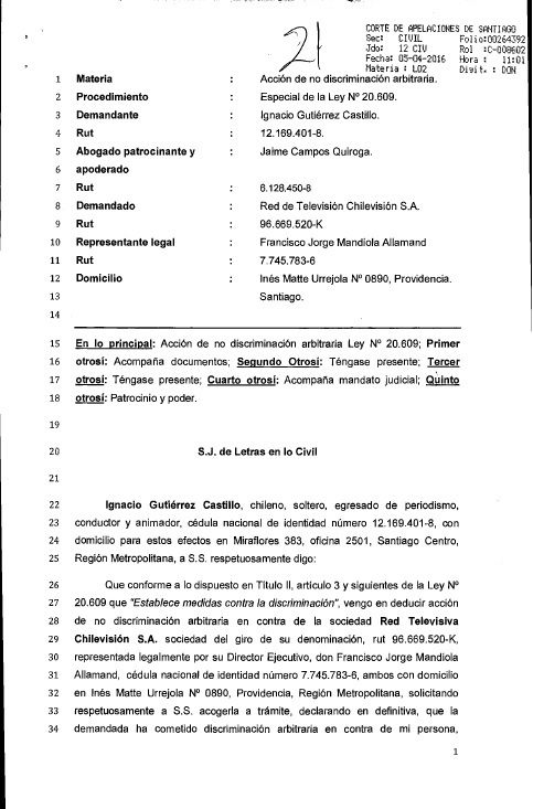 Ayer se supo que Ignacio Gutiérrez, tras su salida de Chilevisión, interpuso una demanda en contra de Chilevisión (lee la nota acá). Hoy se conocieron los detalles de esta acción en un documento publicado en el sitio del Poder Judicial. El relato comienza con un repaso por la vida personal del ex animador de "La mañana […]
