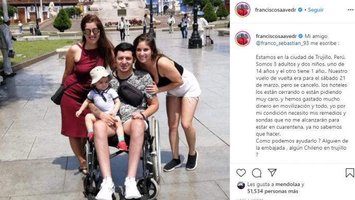 Luego agregó: "Yo por mi condición necesito mis remedios y sondas que no me alcanzarán para estar en cuarentena, ya no sabemos qué hacer’". Finalmente Pancho cerró este mensaje preguntando a sus seguidores cómo ayudar a la pareja. "¿Alguien de la embajada, algún chileno en Trujillo?", preguntó.
