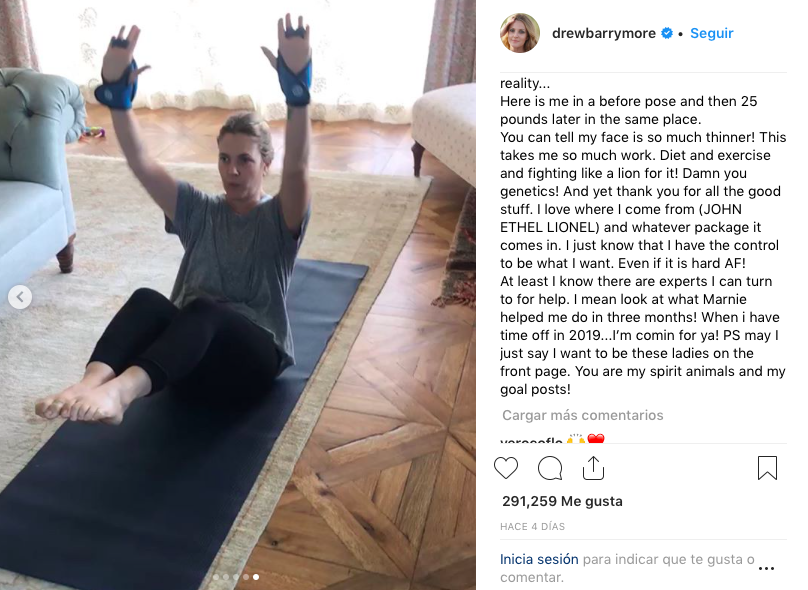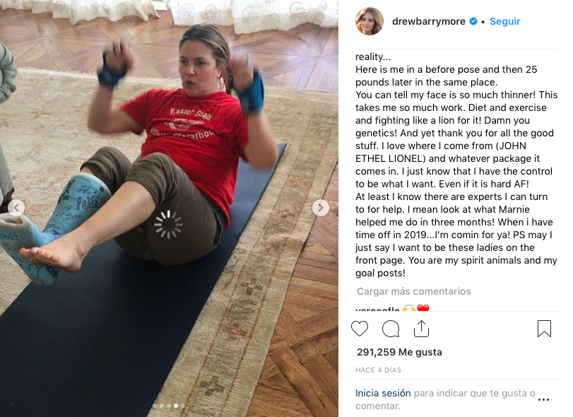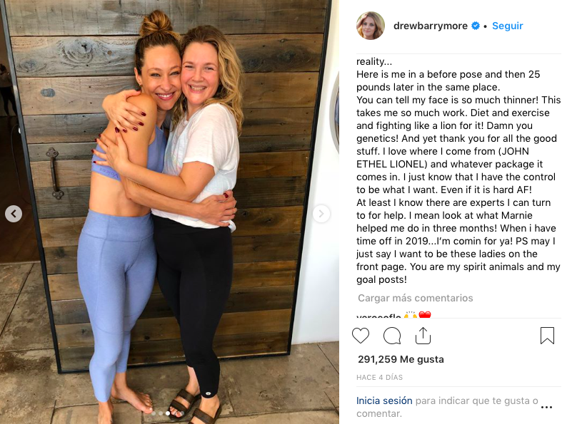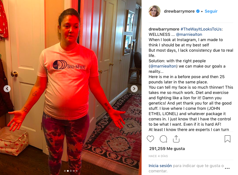 En total, la actriz bajó 12 kilos que se reflejan en distintas fotografías. "Aquí estoy en la misma postura antes y después de perder 12 kilos (…) ¡Mi cara es mucho más delgada! Me ha llevado mucho trabajo. ¡Dieta y ejercicio y luchar como un león por hacerlo! ¡Maldita sea mi genética!”, escribe Drew en su cuenta de Instagram.