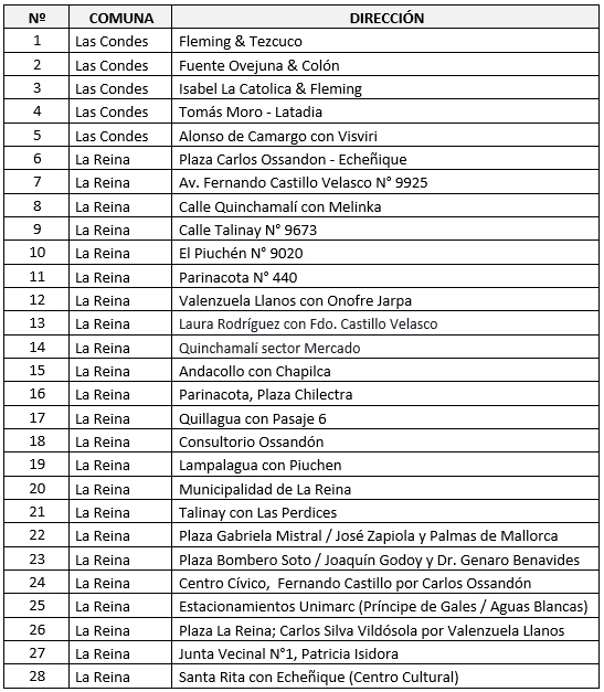 Los 28 puntos de abastecimiento alternativo de agua potable en Las Condes y La Reina son los siguientes: