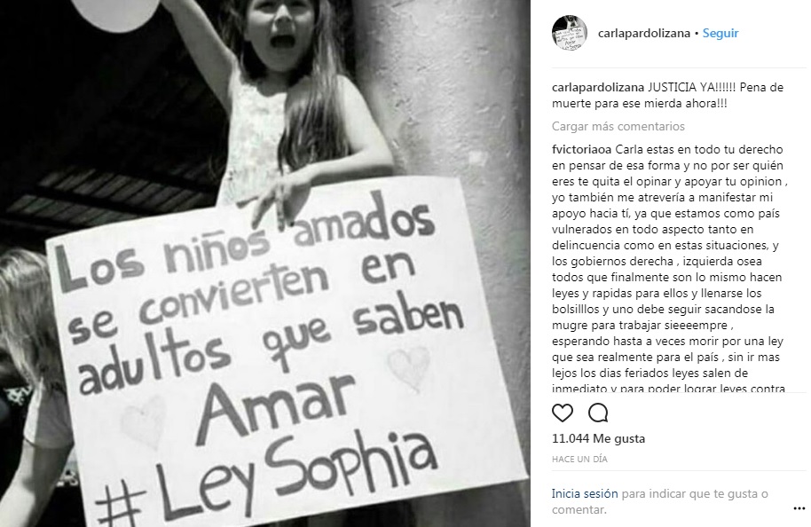 Con la frase "JUSTICIA YA!!!!!! Pena de muerte para ese mierda ahora!!! , Carla Pardo se manifestó en contra de la formalización por parricidio de Francisco Ríos Ríos de 26 años, señalado como el autor del asesinato de la menor Sofía y que deberá permanecer en prisión preventiva por los 5 meses que dure la investigación.