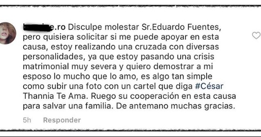 “Disculpe molestar Sr.Eduardo Fuentes, pero quisiera solicitar si me puede apoyar en esta causa, estoy realizando una cruzada con diversas personalidades, ya que estoy pasando una crisis matrimonial muy severa y quiero demostrar a mi esposo lo mucho que lo amo, es algo tan simple como subir una foto con un cartel que diga #César Thannia Te Ama. Ruego su cooperación en esta causa para salvar una familia. De antemano muchas gracias”, escribió la cibernauta.