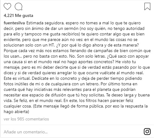 “He visto tu mensaje, pero es mi deber decirte que si de verdad estás pasando por lo que dices y si de verdad quieres arreglar lo que ocurre, vuélcate al mundo real. Este es virtual. Dedícate en lo concreto y deja de perder tiempo pidiendo fotos inútiles de mí o de cualquiera con un letrero. Por último, toma en cuenta qué hay iniciativas más relevantes para el planeta que podrían necesitar ese espacio de difusión que tú hoy solicitas. Te deseo larga y buena vida. Se feliz, en el mundo real. En éste, los filtros hacen parecer feliz cualquier cosa”, escribió Fuentes, agregando que el mensaje llegó de forma pública, “por eso la respuesta la hago abierta”.