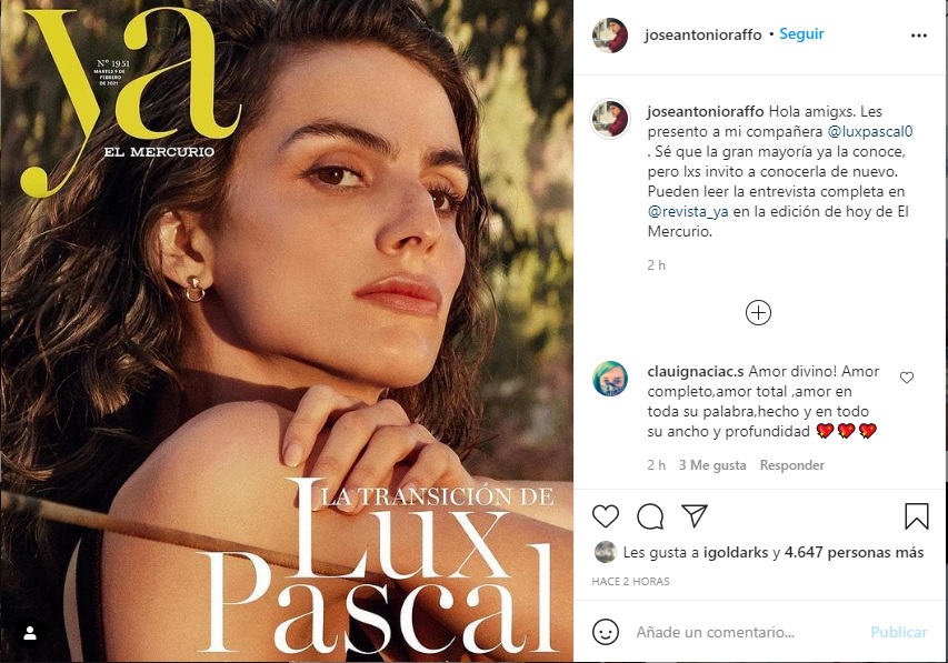 "Hola amigxs. Les presento a mi compañera @luxpascal0. Sé que la gran mayoría ya la conoce, pero lxs invito a conocerla de nuevo. Pueden leer la entrevista completa en @revista_ya en la edición de hoy de El Mercurio", escribió el actor de "Perdona Nuestros Pecados" en su publicación. Raffo acompañó su mensaje con una foto de la portada que protagoniza su pareja.
