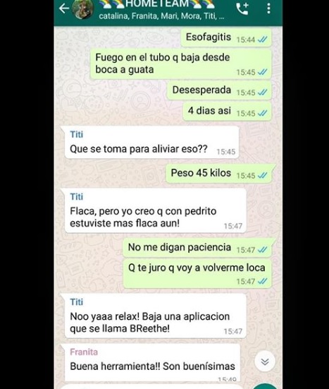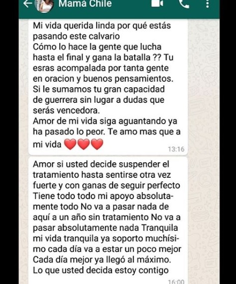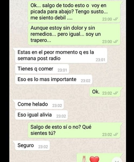 Luego, agregó: “Los remedios han ayudado, pero poco… o, más bien, lento. Llevo una semana con esofagitis, lo que equivale a sentir, incluso la saliva, como si te tragaras un fósforo prendido. Después de casi dos días sin comer y solo tomar muy poco líquido, hoy recién pude disfrutar 2 helados de agua y un huevo a la copa. Estoy pesando 45 kilos. También por la radio se me cayó el pelo en el área irradiada. Aunque eso me da igual. Lo tapo con pañuelo. He llorado desesperadamente. Pensado si quizás de tanto dolor me volveré loca. Sentir que mi cuerpo es un trapero y no veo cómo hacerlo avanzar. Incluso me enojé con Dios un día… “¡Hasta cuándo! Ya llevo 3 años por la mierda, necesito estar sana. ¿Qué te cuesta?” , le grité al cielo desconsolada".