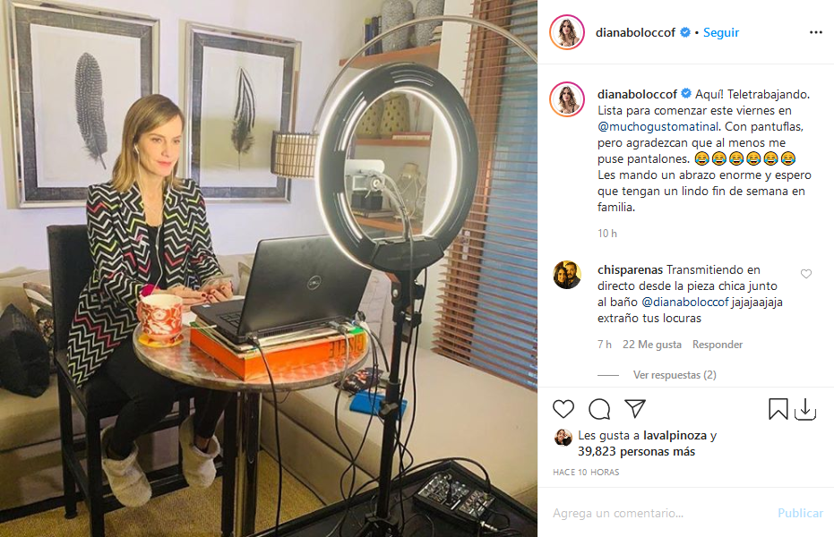 "Teletrabajando. Lista para comenzar este viernes en @muchogustomatinal. Con pantuflas, pero agradezcan que al menos me puse pantalones. 😂😂😂😂😂😂 Les mando un abrazo enorme y espero que tengan un lindo fin de semana en familia, escribió junto a la publicación.