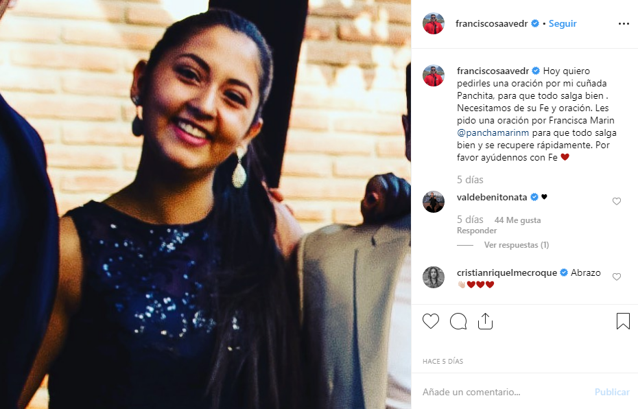 Se trata de su cuñada, Francisca Marin, que según lo que ha mostrado en redes sociales, se encuentra delicada de salud. Es por lo mismo, que en su primer mensaje, Francisco Saavedra compartió una foto de ella. Junto a la imagen, escribió: "Hoy quiero pedirles una oración por mi cuñada Panchita, para que todo salga bien .Necesitamos de su Fe y oración. Les pido una oración por Francisca Marin para que todo salga bien y se recupere rápidamente. Por favor ayúdennos con Fe".