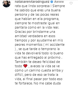 Por lo demás, Natalia también comentó la publicación, muy agradecida del mensaje de su amigo. "Qué linda sorpresa! Siempre he sabido que eres una buena persona y de las pocas reales que habían en ella programa (...) Gracias por brindarme una amistad verdadera en esos tiempos y por ayudarme en mis peores momentos ( mi accidente ), sé que tarde o temprano la vida te devolverá todo lo bueno que has entregado", fue parte de su mensaje.