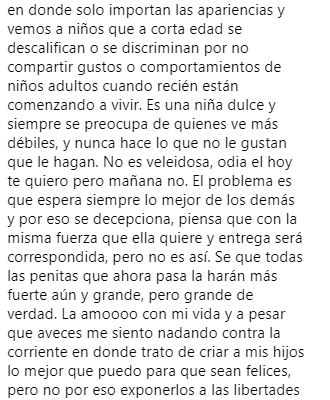 Además, lamentó las veces que ha pasado por momentos difíciles. "El problema es que espera siempre lo mejor de los demás y por eso se decepciona, piensa que con la misma fuerza que ella quiere y entrega será correspondida, pero no es así", escribió.