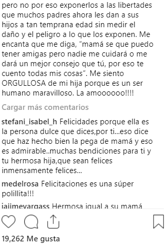 "Me siento tan orgullosa de ella (...) Me encanta ver que vive de verdad su edad y no transa sus valores ni pensamientos por ser aceptada en una sociedad en donde los niños están tan agrandados y creen sabérselas todas porque usan redes sociales y tienen el último celular", fue parte de lo que escribió en sus redes sociales.