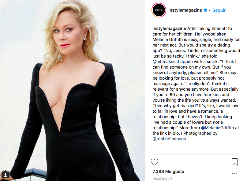 La actriz concedió una entrevista para la edición de septiembre de la revista InStyle. "La Señora Jefa" es el título del reportaje que incluye una sesión fotográfica que no ha pasado desapercibida y que fue compartida por la propia Griffith a través de su cuenta de Instagram.