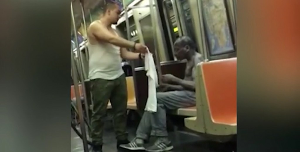 Esta vez, se trata de un joven que iba viajando en el metro subterráneo de Nueva York y sin dudarlo, se para y le entrega su propia polera a un hombre sin hogar que iba sentado solo y con el torso desnudo.