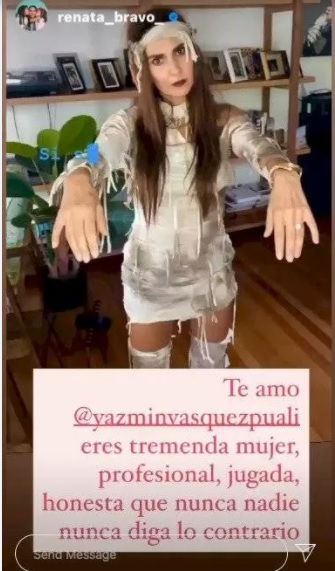 La actriz compartió una foto de la comunicadora disfrazada de momia y con la canción "Mujer maravilla" de Gloria Trevi de fondo. "Te amo @yazminvasquezpuali eres tremenda mujer, profesional, jugada, honesta. Que nunca nadie te diga lo contrario", escribió.
