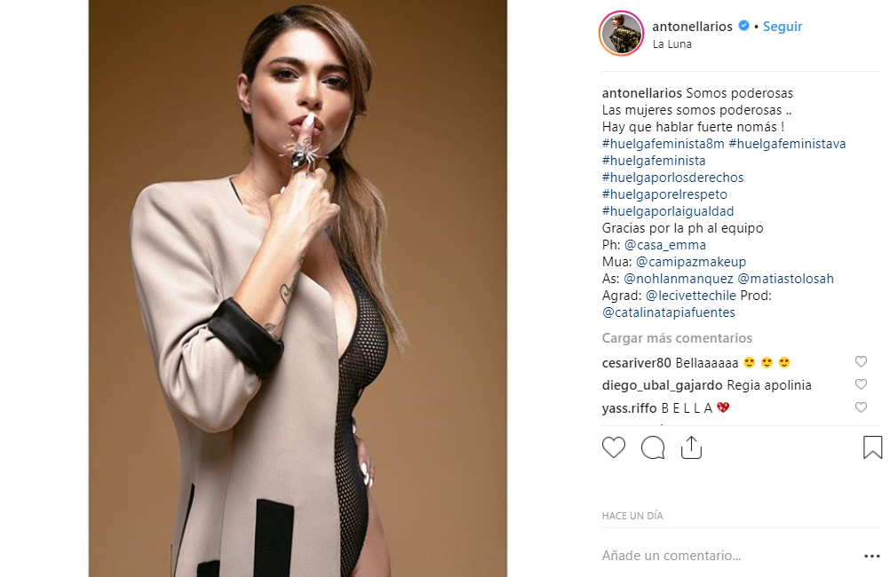 En la fotografía, aparece con un body transparente y una chaqueta formal. En la descripción escribió "Somos poderosas Las mujeres somos poderosas ..Hay que hablar fuerte nomás!" y también ocupó el hashtag #huelgafeminista8m.
