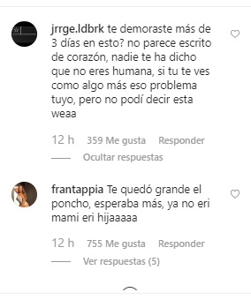 Luego, la cantante agregó: "Siento tanta impotencia ante esta situación. Me duele demasiado ver como mi país sufre de esta manera, me da rabia ver como la televisión resalta lo peor de las protestas para deslegitimar la causa y perder el foco de lo que realmente está pasando..Invito a todos mis demás colegas de la industria a llevar este mensaje, a que el mundo sepa la realidad de lo que está sucediendo en Chile, y también en otros países como Ecuador, España,Venezuela y más.Les pido que por favor sean inteligentes a la hora de actuar, no dejen que el desorden y el caos haga que la verdadera voz del pueblo se diluya, sin embargo, actuar en paz no significa que no se haga firmemente. Fuerza Chile", concluyó.