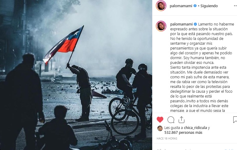 Una de ella fue la joven artista Paloma Mami, quien dedicó un sentido mensaje a la gente chilena. "Lamento no haberme expresado antes sobre la situación por la que está pasando nuestro país. No he tenido la oportunidad de sentarme y organizar mis pensamientos ya que quería subir algo del corazón y apenas he podido dormir. Soy humana también, no pueden olvidar eso nunca", partió diciendo.