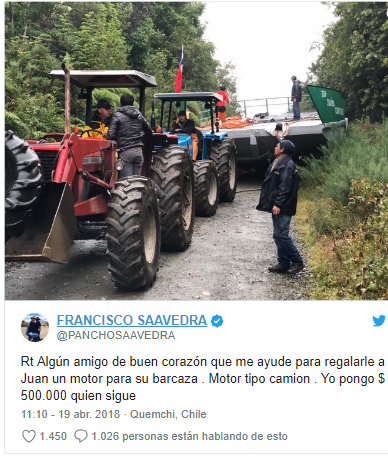 “Por este medio, como familia, queremos dar las gracias primero a Dios, y a Panchito Saavedra. Bueno, como todos sabrán, un empresario nos iba a ayudar con el motor. Hace poco nos enteramos de que el empresario se echó para atrás. Y, hace una semana, Pancho Saavedra nos hizo un tremendo regalo de $2.300.000, lo cual nos ayudó mucho para el motor de la barcaza”, escribió en sus redes sociales.