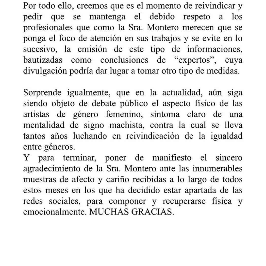 Para luego criticar directamente a los médicos que hicieron este análisis. "Es sorprendente que algunos "expertos" consultados por el medio digital, en concreto los "doctores" Carmen Martín, Leo Cerrud y María Dolores Madan, se permitan, con el simple análisis de unas fotografías publicadas en las redes sociales de la artista, sacar conclusiones".