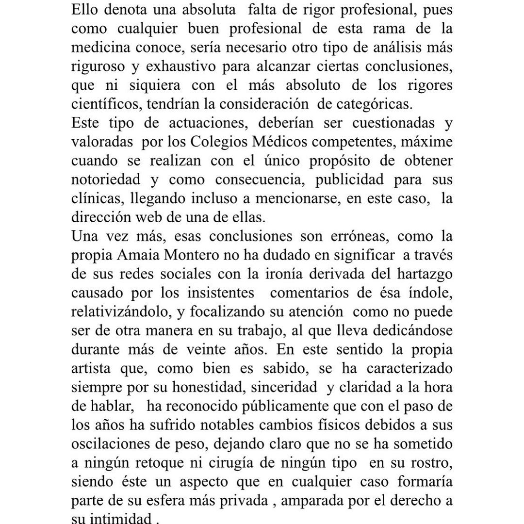 Sin embargo, lo que terminó por explotar todo el tema, fue un artículo titulado: "El espectacular cambio de Amaia Montero: ¿qué opinan los expertos?". Frente a este tema, a través de sus redes sociales, el equipo de Amaia Montero envió un comunicado público criticando este tipo de contenido.