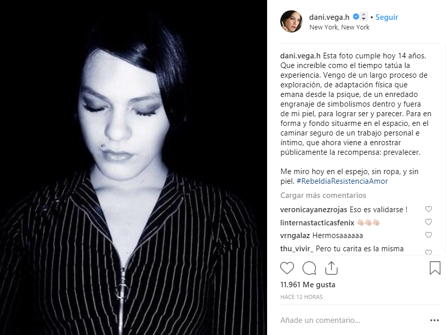 "Qué increíble cómo el tiempo tatúa la experiencia. Vengo de un largo proceso de exploración, de adaptación física que emana desde la psique, de un enredado engranaje de simbolismos dentro y fuera de mi piel, para lograr ser y parecer", comienza narrando.