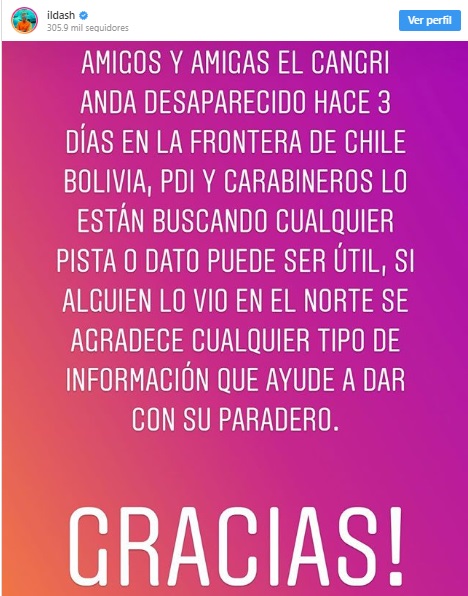 La mamá de "Cangri", Leonor Bravo presentó una denuncia por desaparición a Carabineros y, según testigos y la madre, el ex chico reality habría viajado al norte para hacer trabajos en Antofagasta y fue visto por última vez en San Pedro de Atacama.