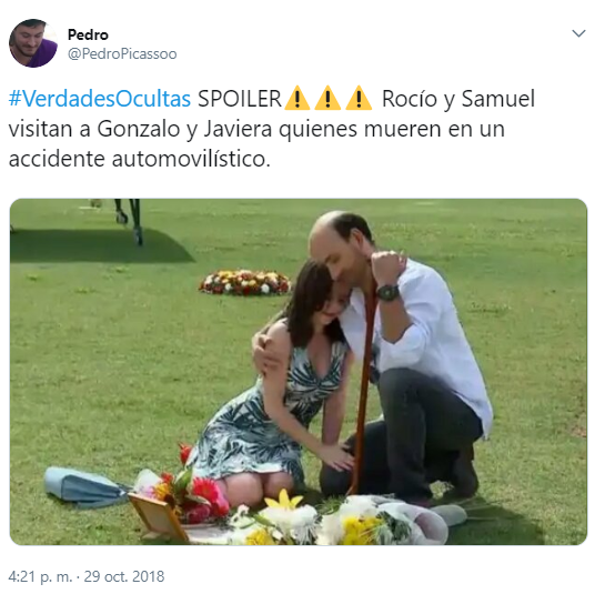 Y en esta plataforma se divulgó últimamente una imagen de la actriz Camila Hirane (Rocío) junto al actor Cristián Carvajal (Samuel). Ambos se ven abrazados en un cementerio, y la foto se encuentra acompañada por un texto que dice: “Rocío y Samuel visitan a Gonzalo y Javiera, quienes mueren en un accidente automovilístico“.