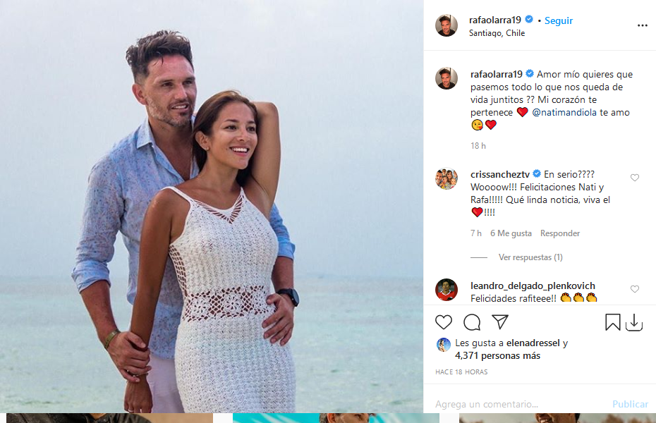 Ante la sorpresa, el animador Cristián Sánchez comentó la publicación para confirmar si realmente darán el gran sí. "En serio???? Woooow!!! Felicitaciones Nati y Rafa!!!!! Qué linda noticia, viva el ❤️!!!!", escribió.
