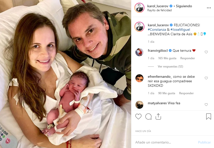 Quien también felicitó a Viñuela, fue Karol Lucero. Primero, compartió la foto en que aparece el animador, junto a su esposa y su bebé y escribió "FELICITACIONES! #Constanza & #JoseMiguel...BIENVENIDA Clarita de Asis".