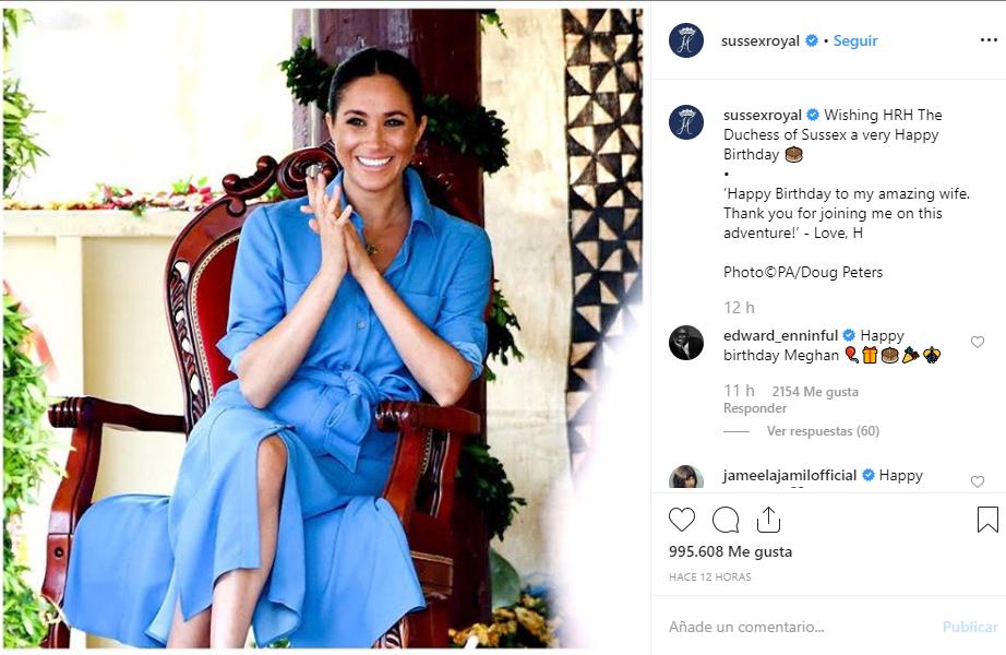En la publicación, se ven dos mensajes. El primero es uno más formal, probablemente realizado por la persona a cargo de la cuenta. "Deseamos a su alteza real, la duquesa de Sussex un muy feliz cumpleaños", es el mensaje que se ve.