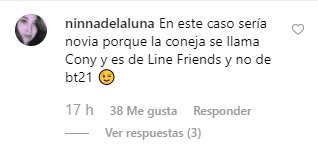 La coneja se llama "Cony" y es un personaje de los stickers de la aplicación de mensajería llamado 'Line'. Ups.