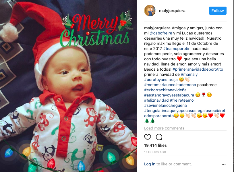 Maly quien publicó una foto del pequeño Lucas con un traje navideño, escribió "Amigos y amigas, junto con mi @cabofreire y mi Lucas queremos desearles una muy feliz navidad!!"