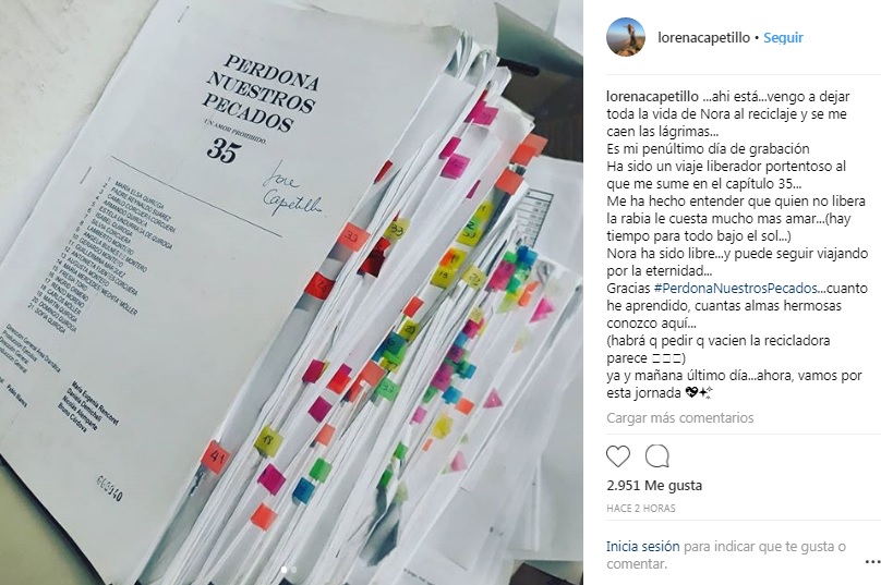 En su cuenta de Instagram, Lorena compartió una imagen de sus libretos en "Perdona nuestros pecados" junto a la frase: "Ahí está...vengo a dejar toda la vida de Nora al reciclaje y se me caen las lágrimas...Es mi penúltimo día de grabación. Ha sido un viaje liberador portentoso al que me sume en el capítulo 35...Me ha hecho entender que quien no libera la rabia le cuesta mucho mas amar...(hay tiempo para todo bajo el sol...) Nora ha sido libre...y puede seguir viajando por la eternidad...Gracias #PerdonaNuestrosPecados...cuanto he aprendido, cuantas almas hermosas conozco aquí...(habrá q pedir q vacien la recicladora parece)ya y mañana último día...ahora, vamos por esta jornada", escribió.