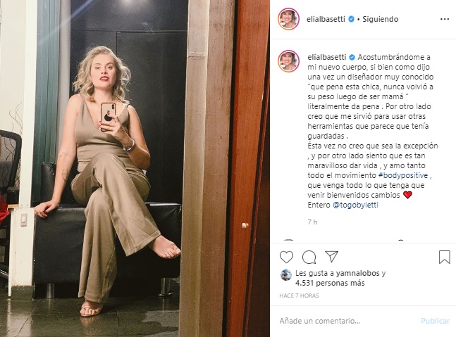 'Acostumbrándome a mi nuevo cuerpo. Si bien como dijo una vez un diseñador muy conocido 'qué pena esta chica, nunca volvió a su peso luego de ser mamá' literalmente da pena. Por otro lado, creo que me sirvió para usar otras herramientas que parece que tenía guardadas', escribió la ex chica reality en su cuenta de Instagram.