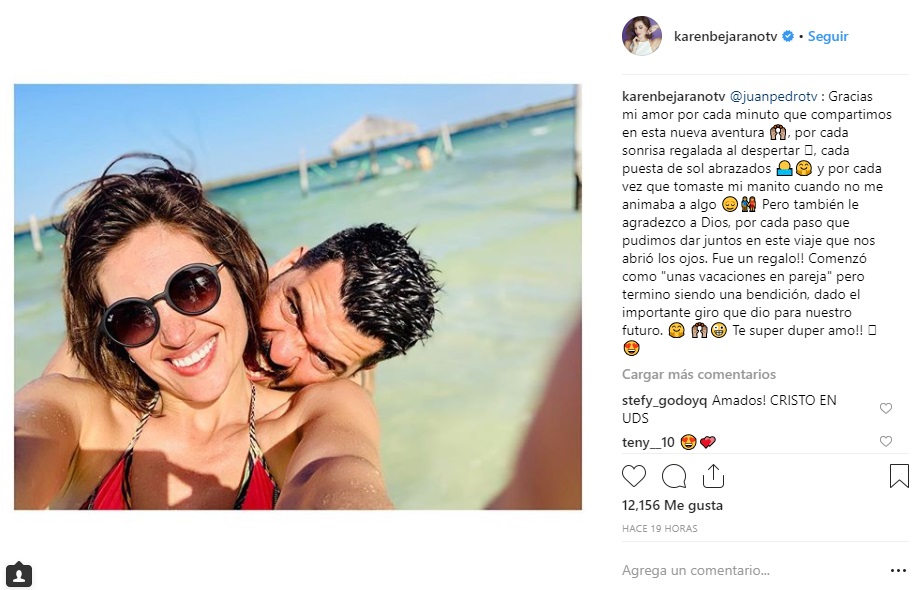 “@juanpedrotv : Gracias, mi amor, por cada minuto que compartimos en esta nueva aventura , por cada sonrisa regalada al despertar, cada puesta de sol abrazados y por cada vez que tomaste mi manito cuando no me animaba a algo. Pero también le agradezco a Dios, por cada paso que pudimos dar juntos en este viaje que nos abrió los ojos. ¡¡Fue un regalo!! Comenzó como ‘unas vacaciones en pareja’, pero terminó siendo una bendición, dado el importante giro que dio para nuestro futuro. ¡¡Te súper duper amo!!”, fue lo que escribió la panelista de "Muy buenos días a todos" junto a una foto en la playa de ambos.