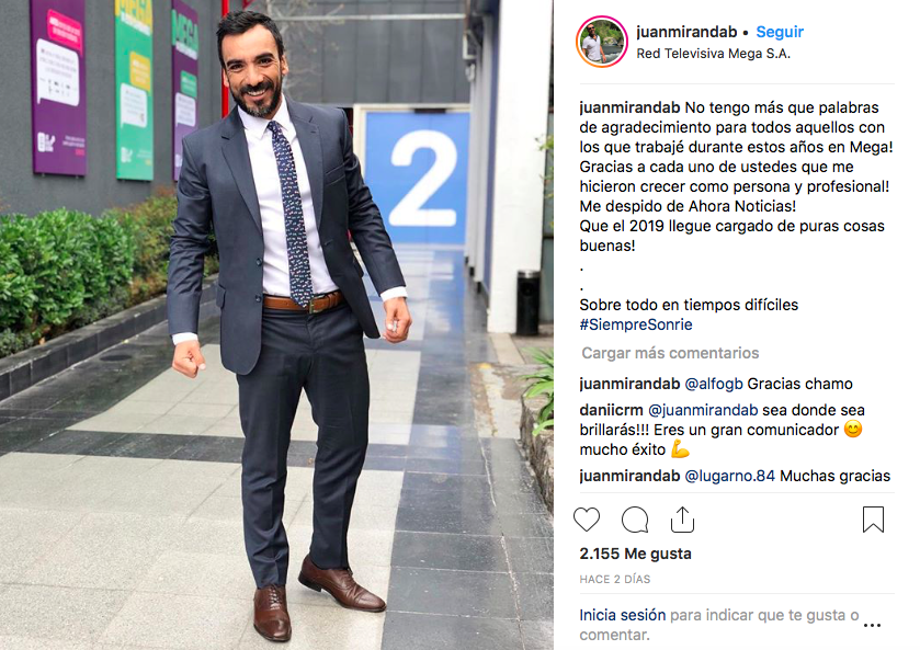 Por otro y a través de su cuenta de Instagram, el emblemático periodista de Mega, sólo tuvo cariñosas palabras de despedida. "No tengo más que palabras de agradecimiento para todos aquellos con los que trabajé durante estos años en Mega! Gracias a cada uno de ustedes que me hicieron crecer como persona y profesional! Me despido de Ahora Noticias! Que el 2019 llegue cargado de puras cosas buenas", escribió