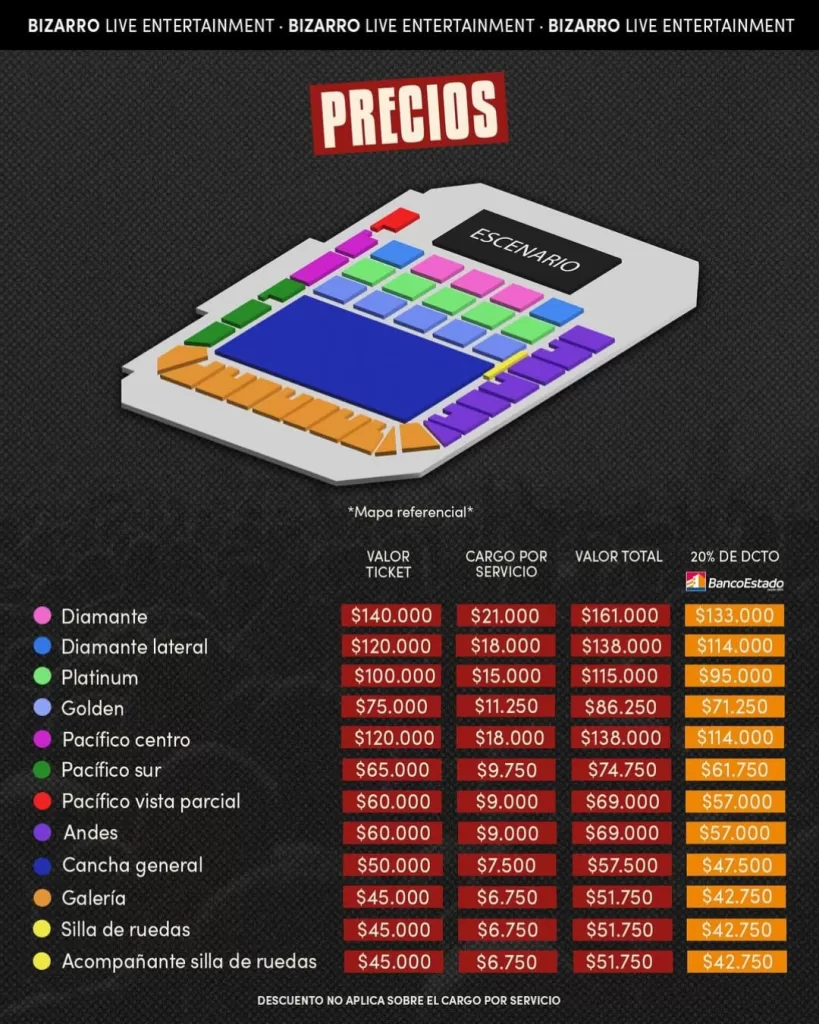La productora Bizarro informó a través de sus redes sociales finalmente la lista de los precios y los sectores del recinto. Donde la artista promete una noche llena de baile, emociones y glitter.