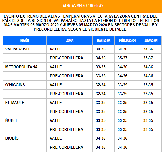 La Dirección Meteorológica de Chile emitió esta semana una alerta por un evento extremo de altas temperaturas, entre las regiones de Valparaíso y Bio Bio.