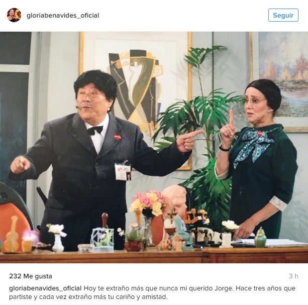 "Hoy te extraño más que nunca mi querido Jorge. Hace tres años que partiste y cada vez extraño más tu cariño y amistad", escribió en su cuenta de Instagram junto a una foto donde aparece Pedreros interpretando a su recordado personaje, Espinita, y ella, a la secretaria Gertrudis.