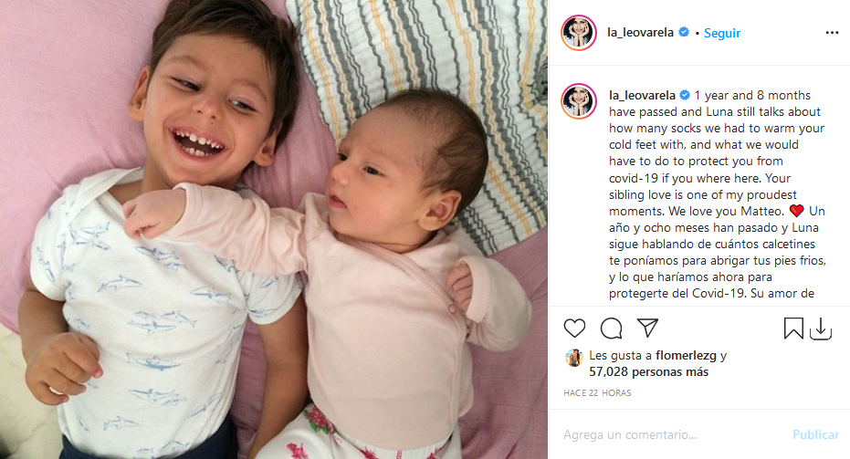 "Un año y ocho meses han pasado y Luna sigue hablando de cuántos calcetines te poníamos para abrigar tus pies frios, y lo que haríamos ahora para protegerte del Covid-19. Su amor de hermano es uno de mis más grandes orgullos. Te amamos Matteo", expresó junto a la imagen de ambos cuando Luna era apenas una bebé.